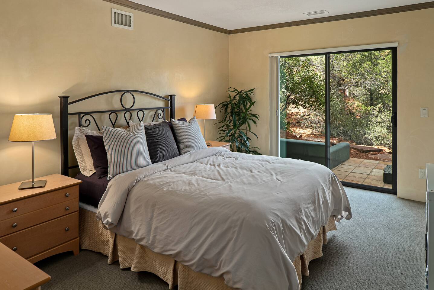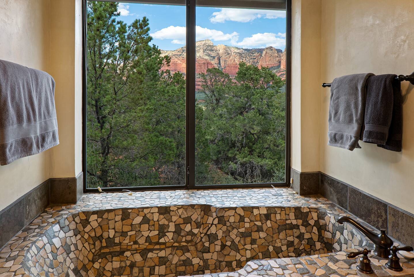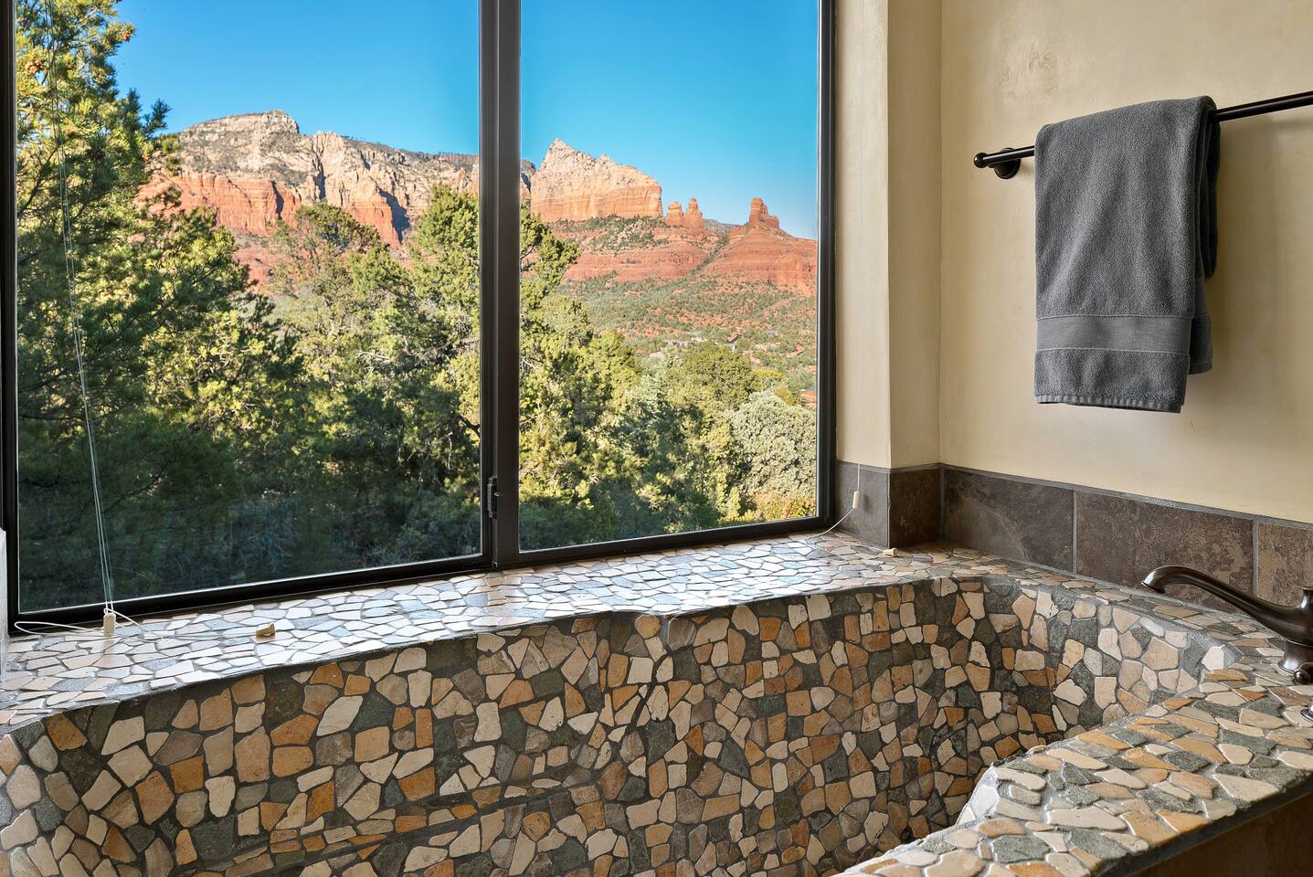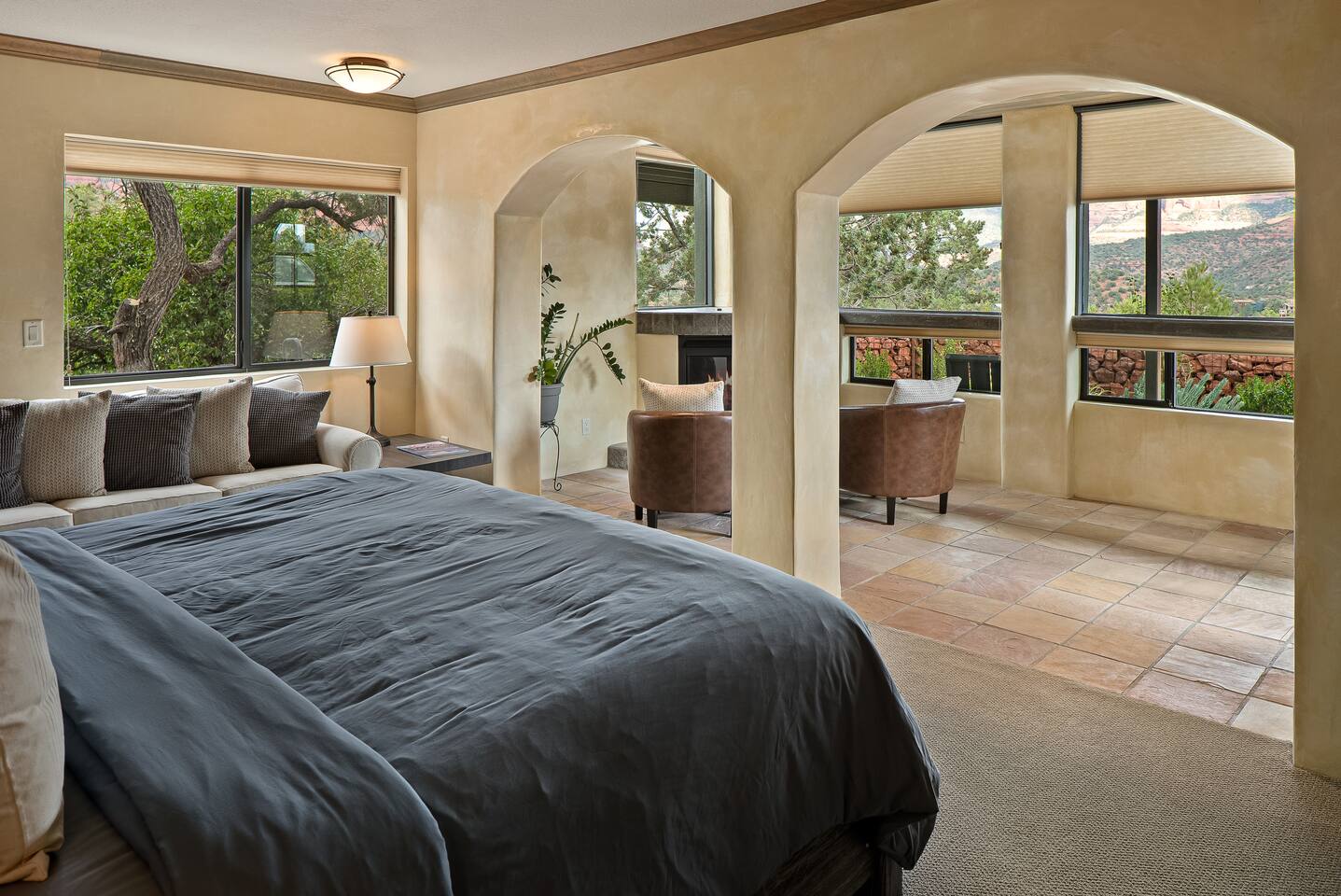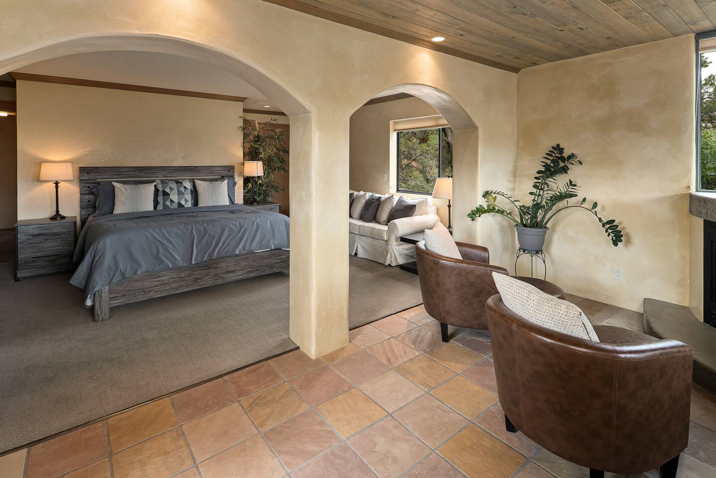 Bed 1 (primary) Second floor This Bedroom is a dream. View Sedona’s magical spires through pristine picture windows from a deeply comfortable King bed. Stunning views present themselves even from the tub, where windows ascend to the ceiling above the tastefully tiled modern bath. Hand-plastered walls and the ensuite bathroom with tiled walk-in shower, double sinks, and vanity complete this perfect picture. An oversized balcony with two comfy chairs are ready for romantic evenings and the perfect cup of morning coffee while you relish Sedona’s crisp, clean air. Bed 2 (suite) First floor This suite features a separate entrance that opens to a double-arched main room. A full-sized couch and King bed connect to a tiled floor with a fireplace, and the 180-degree views of Red Rock country soothe and inspire. A private door connects to a shared full bath with two shower rooms. Bed 3 (First floor) This carpeted bedroom with a rustic wood King bed has a patio that opens directly onto the natural landscape and breathtaking Red Rock views. The adjacent four-seat spa/hot tub is perfect for cool autumn afternoons or for a relaxing evening soak. Kitchen (Second floor) Everything you need from baking sheets to serving dishes are tucked away in this fully stocked kitchen with four-burner countertop gas stove that is open to the dining, living and recreation areas. Comfortable bar-style seating makes it easy for you to visit, entertain and chat with guests while you prepare food. Stretching from countertop to ceiling, the windows that help define this amazing property never let you forget that your vacation kitchen is nestled in the most beautiful place on earth. Garage: Attached garage with room for one car (with a Tesla charger) and storage space for mountain bikes -plus a bike work stand and floor pump. *New in Fall ‘23- were offering usage of our 2 new Trek e-bikes for paved commutes to area attractions (not to be used on trails).