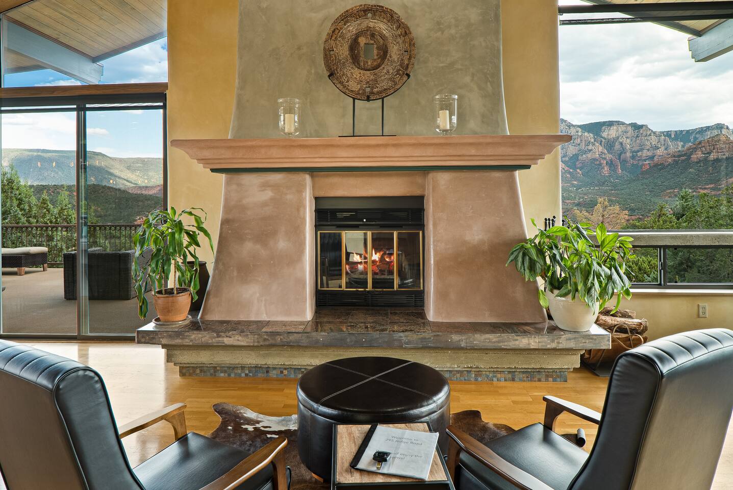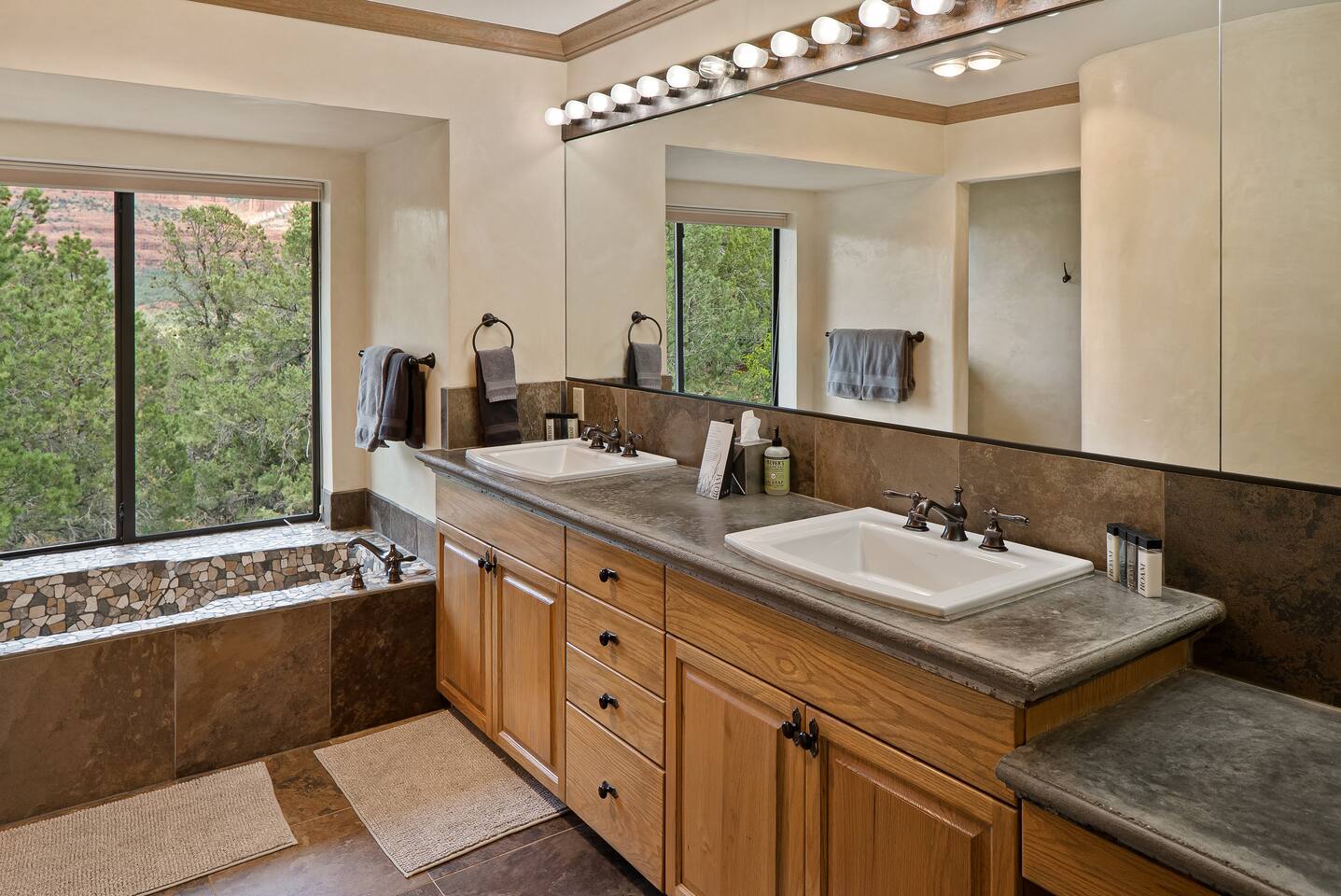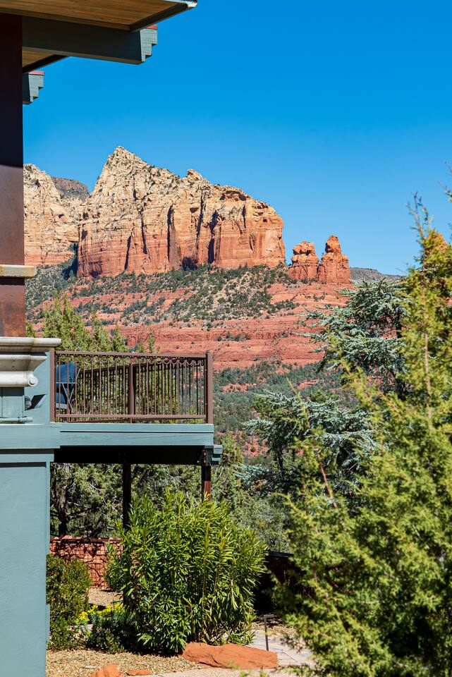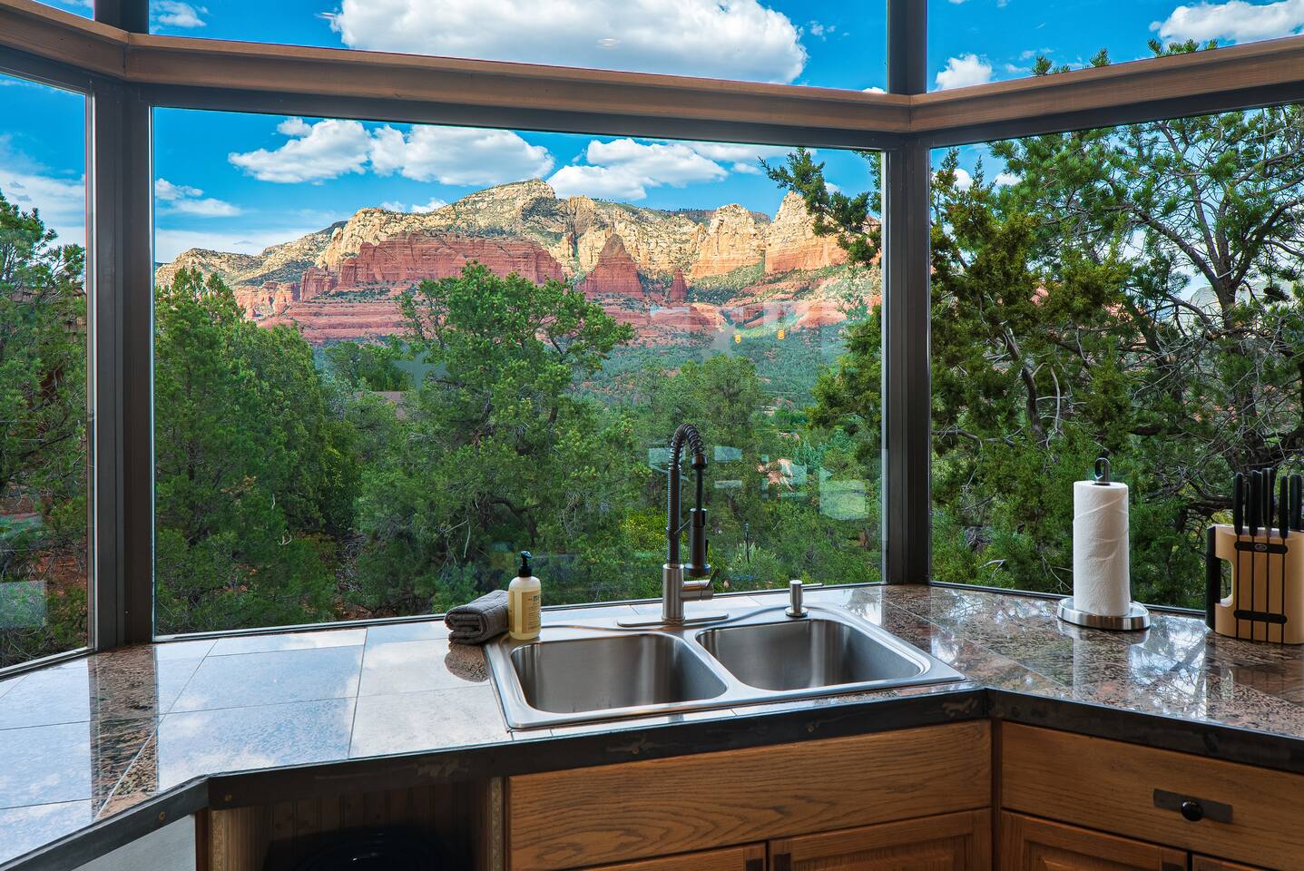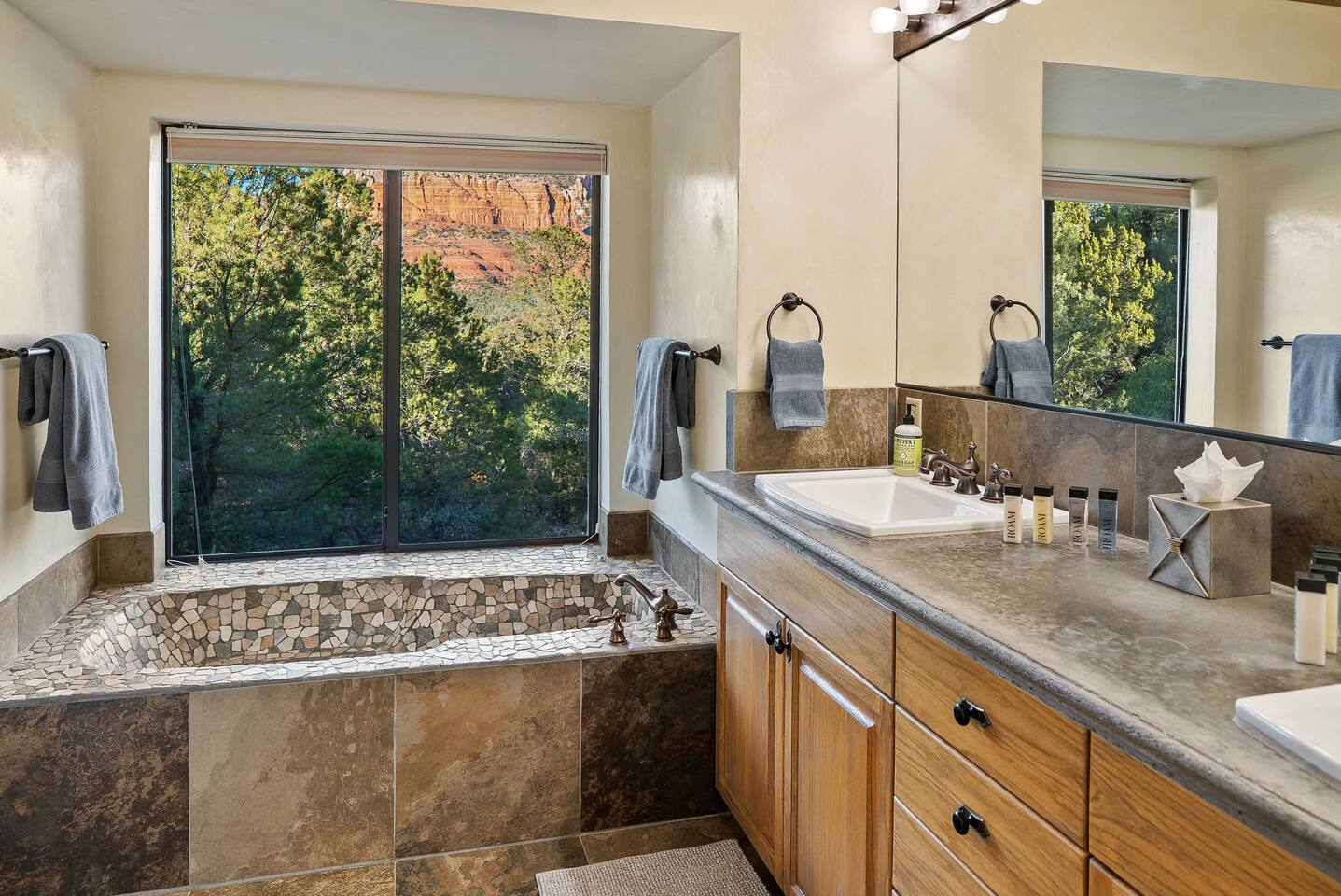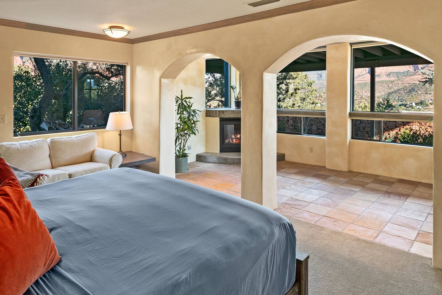 Bed 1 (primary) Second floor This Bedroom is a dream. View Sedona’s magical spires through pristine picture windows from a deeply comfortable King bed. Stunning views present themselves even from the tub, where windows ascend to the ceiling above the tastefully tiled modern bath. Hand-plastered walls and the ensuite bathroom with tiled walk-in shower, double sinks, and vanity complete this perfect picture. An oversized balcony with two comfy chairs are ready for romantic evenings and the perfect cup of morning coffee while you relish Sedona’s crisp, clean air. Bed 2 (suite) First floor This suite features a separate entrance that opens to a double-arched main room. A full-sized couch and King bed connect to a tiled floor with a fireplace, and the 180-degree views of Red Rock country soothe and inspire. A private door connects to a shared full bath with two shower rooms. Bed 3 (First floor) This carpeted bedroom with a rustic wood King bed has a patio that opens directly onto the natural landscape and breathtaking Red Rock views. The adjacent four-seat spa/hot tub is perfect for cool autumn afternoons or for a relaxing evening soak. Kitchen (Second floor) Everything you need from baking sheets to serving dishes are tucked away in this fully stocked kitchen with four-burner countertop gas stove that is open to the dining, living and recreation areas. Comfortable bar-style seating makes it easy for you to visit, entertain and chat with guests while you prepare food. Stretching from countertop to ceiling, the windows that help define this amazing property never let you forget that your vacation kitchen is nestled in the most beautiful place on earth. Garage: Attached garage with room for one car (with a Tesla charger) and storage space for mountain bikes -plus a bike work stand and floor pump. *New in Fall ‘23- were offering usage of our 2 new Trek e-bikes for paved commutes to area attractions (not to be used on trails).
