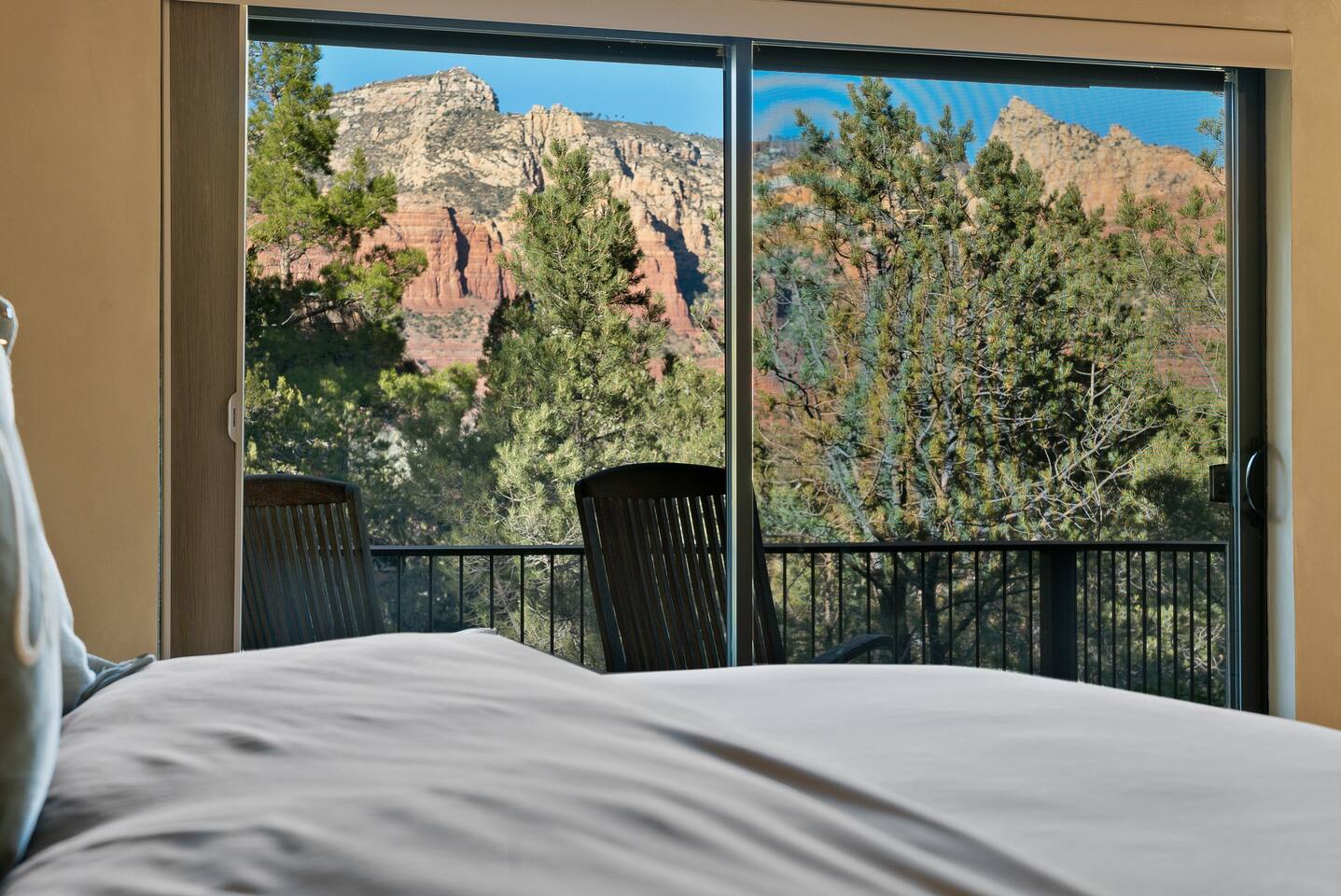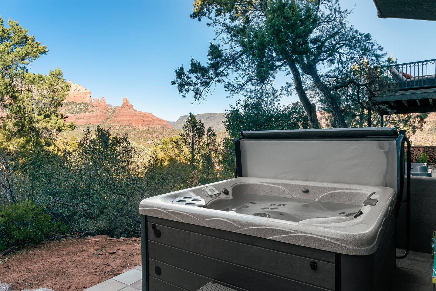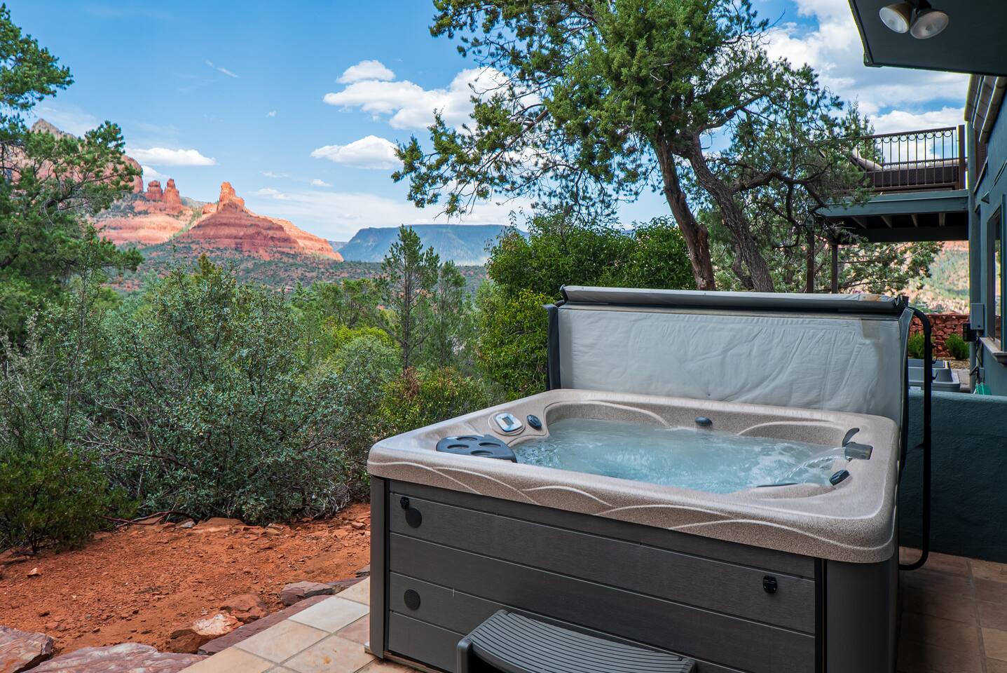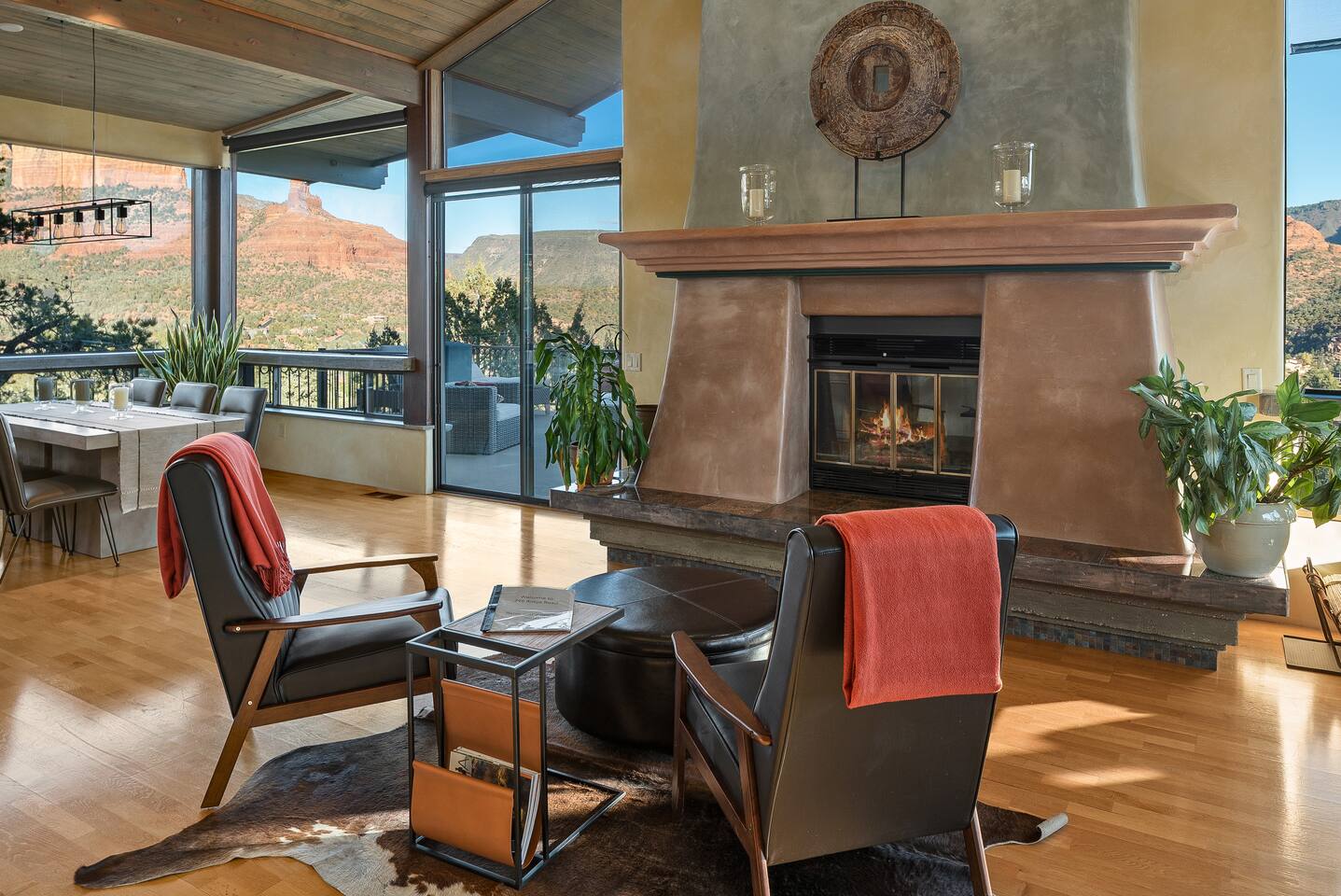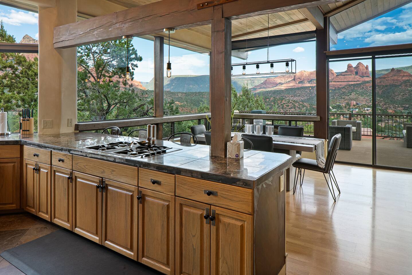 Bed 1 (primary) Second floor This Bedroom is a dream. View Sedona’s magical spires through pristine picture windows from a deeply comfortable King bed. Stunning views present themselves even from the tub, where windows ascend to the ceiling above the tastefully tiled modern bath. Hand-plastered walls and the ensuite bathroom with tiled walk-in shower, double sinks, and vanity complete this perfect picture. An oversized balcony with two comfy chairs are ready for romantic evenings and the perfect cup of morning coffee while you relish Sedona’s crisp, clean air. Bed 2 (suite) First floor This suite features a separate entrance that opens to a double-arched main room. A full-sized couch and King bed connect to a tiled floor with a fireplace, and the 180-degree views of Red Rock country soothe and inspire. A private door connects to a shared full bath with two shower rooms. Bed 3 (First floor) This carpeted bedroom with a rustic wood King bed has a patio that opens directly onto the natural landscape and breathtaking Red Rock views. The adjacent four-seat spa/hot tub is perfect for cool autumn afternoons or for a relaxing evening soak. Kitchen (Second floor) Everything you need from baking sheets to serving dishes are tucked away in this fully stocked kitchen with four-burner countertop gas stove that is open to the dining, living and recreation areas. Comfortable bar-style seating makes it easy for you to visit, entertain and chat with guests while you prepare food. Stretching from countertop to ceiling, the windows that help define this amazing property never let you forget that your vacation kitchen is nestled in the most beautiful place on earth. Garage: Attached garage with room for one car (with a Tesla charger) and storage space for mountain bikes -plus a bike work stand and floor pump. *New in Fall ‘23- were offering usage of our 2 new Trek e-bikes for paved commutes to area attractions (not to be used on trails).
