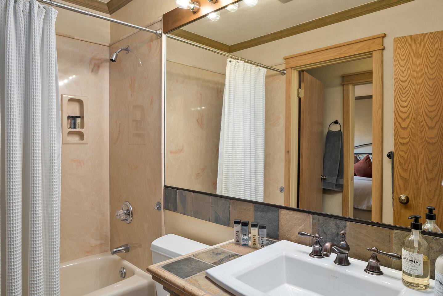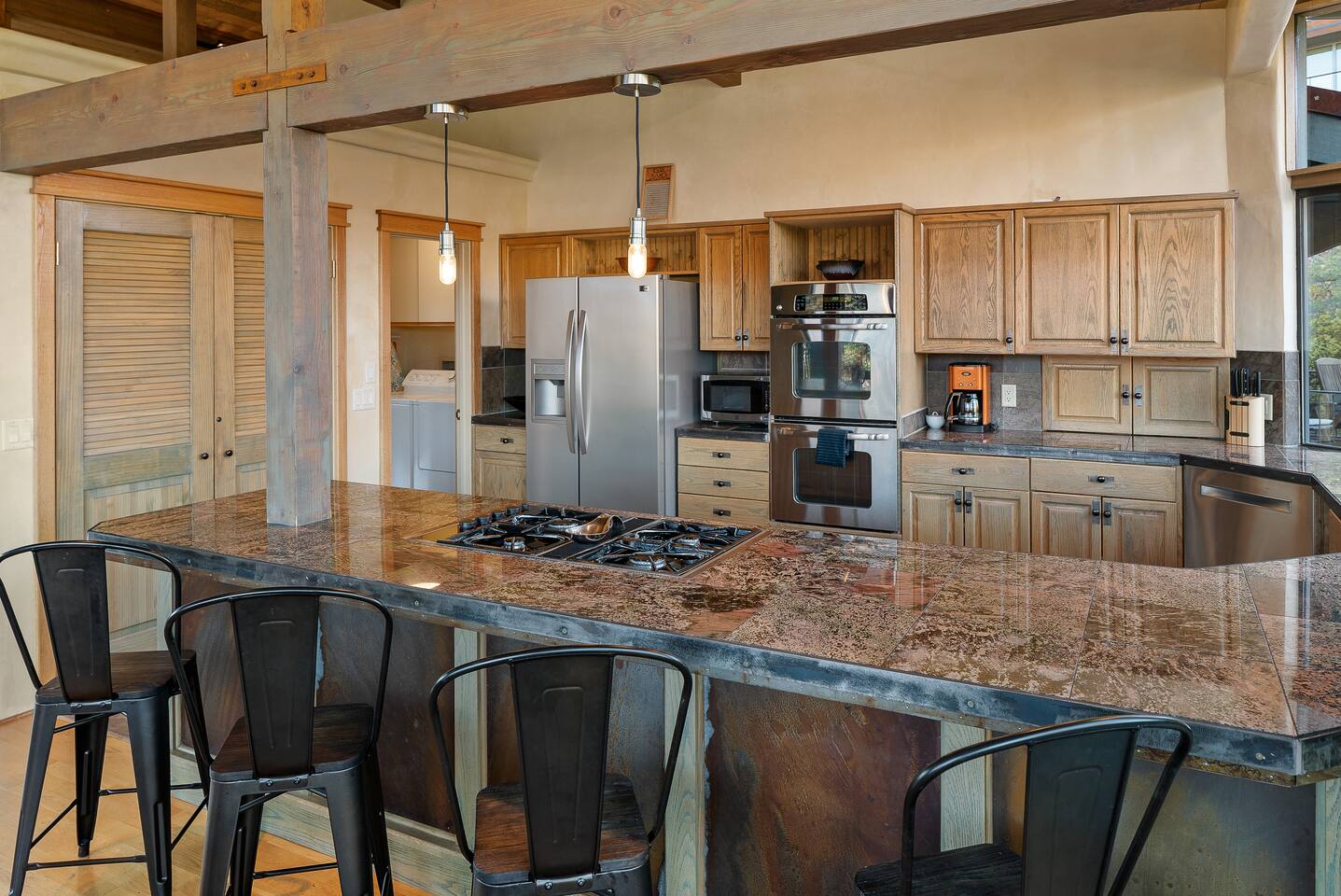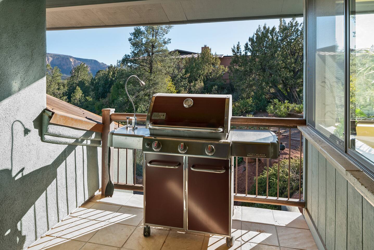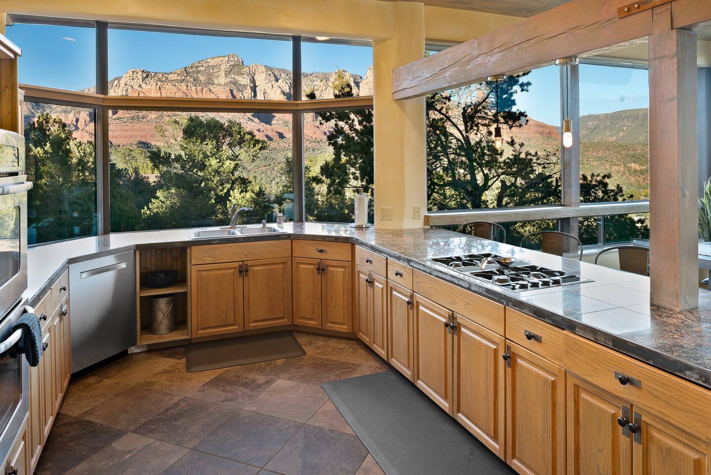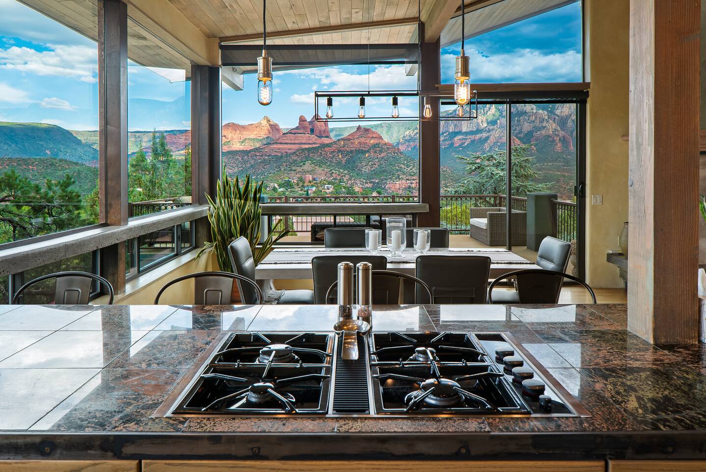 Bed 1 (primary) Second floor This Bedroom is a dream. View Sedona’s magical spires through pristine picture windows from a deeply comfortable King bed. Stunning views present themselves even from the tub, where windows ascend to the ceiling above the tastefully tiled modern bath. Hand-plastered walls and the ensuite bathroom with tiled walk-in shower, double sinks, and vanity complete this perfect picture. An oversized balcony with two comfy chairs are ready for romantic evenings and the perfect cup of morning coffee while you relish Sedona’s crisp, clean air. Bed 2 (suite) First floor This suite features a separate entrance that opens to a double-arched main room. A full-sized couch and King bed connect to a tiled floor with a fireplace, and the 180-degree views of Red Rock country soothe and inspire. A private door connects to a shared full bath with two shower rooms. Bed 3 (First floor) This carpeted bedroom with a rustic wood King bed has a patio that opens directly onto the natural landscape and breathtaking Red Rock views. The adjacent four-seat spa/hot tub is perfect for cool autumn afternoons or for a relaxing evening soak. Kitchen (Second floor) Everything you need from baking sheets to serving dishes are tucked away in this fully stocked kitchen with four-burner countertop gas stove that is open to the dining, living and recreation areas. Comfortable bar-style seating makes it easy for you to visit, entertain and chat with guests while you prepare food. Stretching from countertop to ceiling, the windows that help define this amazing property never let you forget that your vacation kitchen is nestled in the most beautiful place on earth. Garage: Attached garage with room for one car (with a Tesla charger) and storage space for mountain bikes -plus a bike work stand and floor pump. *New in Fall ‘23- were offering usage of our 2 new Trek e-bikes for paved commutes to area attractions (not to be used on trails).
